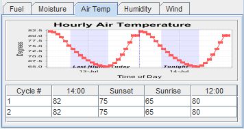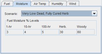The Moisture tab allows you to select the initial fuel moistures used in the fire behavior calculations. Note that the 1-hour dead fuel moisture level will be adjusted according to hourly air temperature, humidity and solar heating.