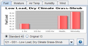 The Fuel tab contains a control for selecting a fuel model. A graph of the fuel load is shown for the selected model. Clicking the [?] icon will display a help guide with photos to assist you in selecting the appropriate fuel model.