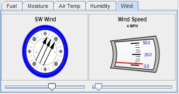 The sliders in the Wind tab allows you control the general wind direction and speed used throughout the fire behavior calculations.
